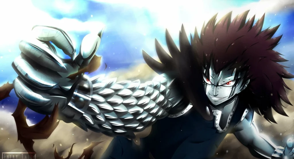 Gajeel é outro Dragon Slayer extremamente poderoso, especializado na Magia do Ferro. Ele pode transformar partes do corpo em metal, criando armas como espadas e lanças diretamente de si mesmo. Além disso, assim como Natsu, ele pode consumir seu elemento — no caso, o ferro — para recuperar energia e aumentar seu poder.